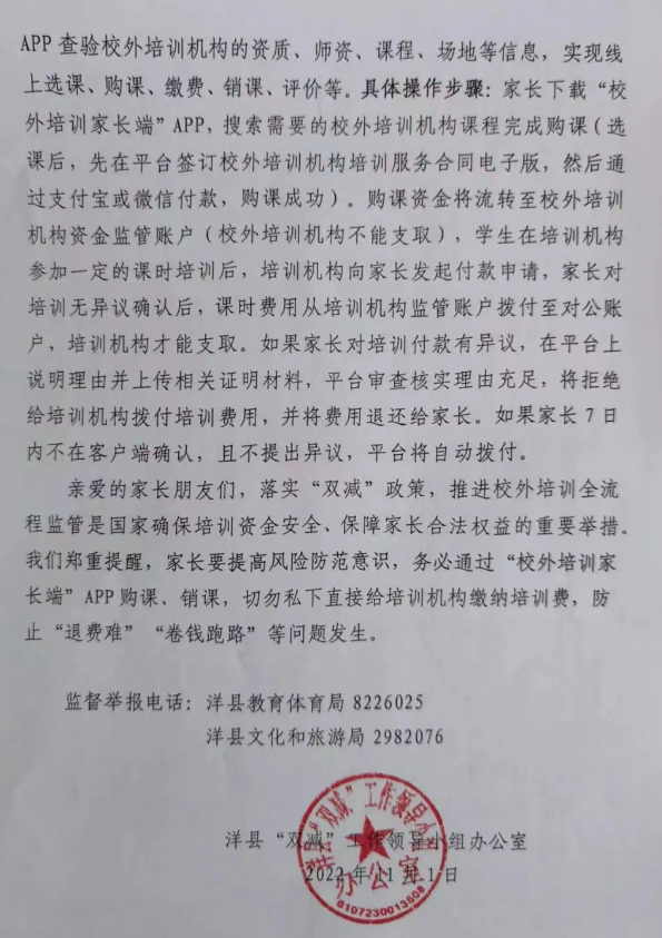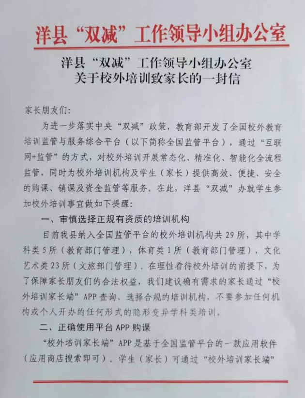 “双减”工作领导小组办公室关于校外培训致家长的一封信